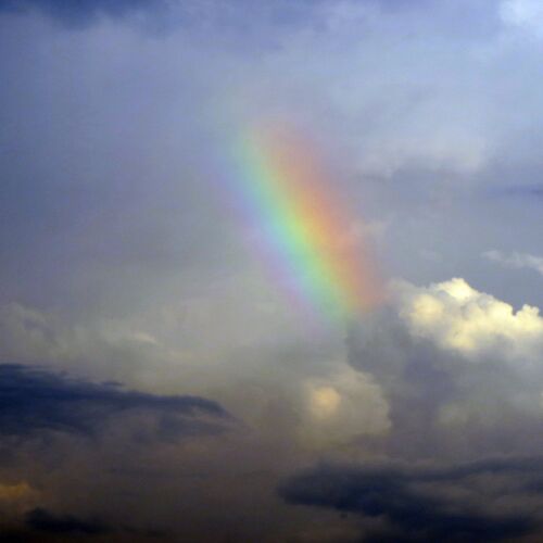 おおーっ、カラフル・ザ・レインボー!ちょっと長さはものたりなけいど、色会いはかなりクッキリでてる(色調修正済み^^;)。幾重にも雲が重なり合う間隙を縫うように太い虹が立っていた。すぐに雲にのみこまれてったけども、これだけ立派な虹は久しぶり…