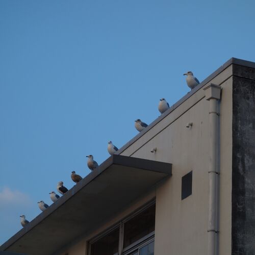 地方の小さな港です。過疎が激しく進んでいて、ほんとここら海岸の端に近いあたりだと、長屋のように続く家並みも5件に1件は空き家の状態です。このビルディングも今は使われていないようで、暗くなっても電気が点く気配はまったくないです。そんな屋上の縁…