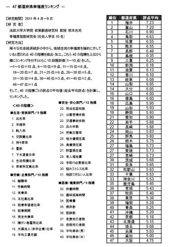 少しまえのことになるが、法政大学の大学院政策創造研究科の坂本教授研究室が47都道府県の幸せ度ランキングの研究結果を発表した。結果は 1位福井県 2位富山県 3位石川県 と裏日本勢=北陸3県が上位を独占していた。裏日本の幸福度がハンパない。降伏、…