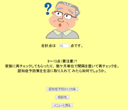 平塚市さんのサイトに 「これって認知症?(認知症簡易チェックシステム)」 パソコンや携帯電話、スマートフォンで簡単に認知症チェックをしてみませんか。 「これって認知症?(認知症簡易チェックシステム)」(外部リンク) 平塚市 「わたしも認知症?」 htt…