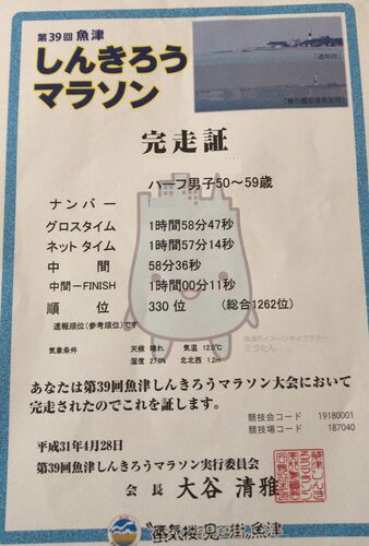 魚津蜃気楼マラソン走ってきました。なんとか無事に完走。2時間切りも達成できました。PB更新とはなりませんでしたが、心配していた後半走りきれるかということもなんとか走りきりました。 天候も良く、気温は低めで、出走前には服装で悩みましたが、結局半…