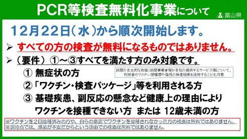 富山県は今日から新型コロナウイルスのPCR検査や抗原検査を無料で受けられる事業を開始した。以下のようにニュースなどにも取り上げられている。この記事だけだとみると「おおースゲー!」希望者が殺到するんじゃないか!?と思うのだがどうだろうか。 ww…