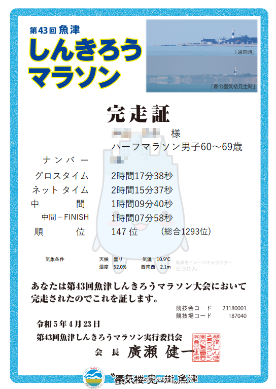 結果。全て杞憂におわる。結果こそそんな褒められたタイムではないんですけど、この状況でよくここまで走ったもんだと、無謀だと言われたらそれまでだが。いろいろ心配性な自分がちょっと情けない。